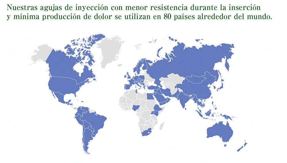 Actualmente, ofrecemos las agujas de inyección que producimos en mercados situados en más de 80 países alrededor del mundo.