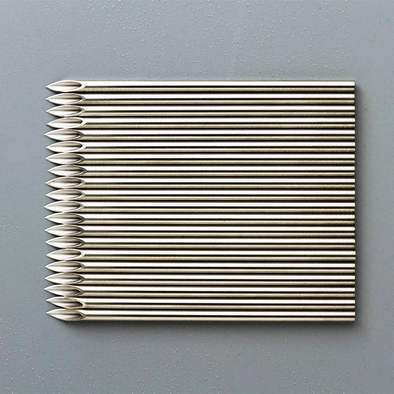 Pipe dimensions specified by the customer can be accommodated to ISO Standard pipe dimensions. ●We are able to accommodate sizes from 33G (outside diameter 0.20 mm, wall thickness 0.06 mm) to 14G (outside diameter 2.10 mm, wall thickness 0.2 mm). ●Pipe dimensions specified by the customer can be accommodated to ISO Standard pipe dimensions. ● A laser marking service for cut pipe is also available. |