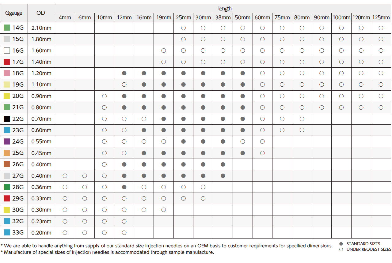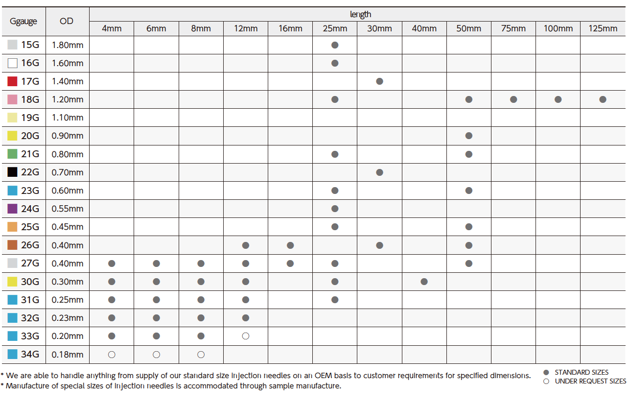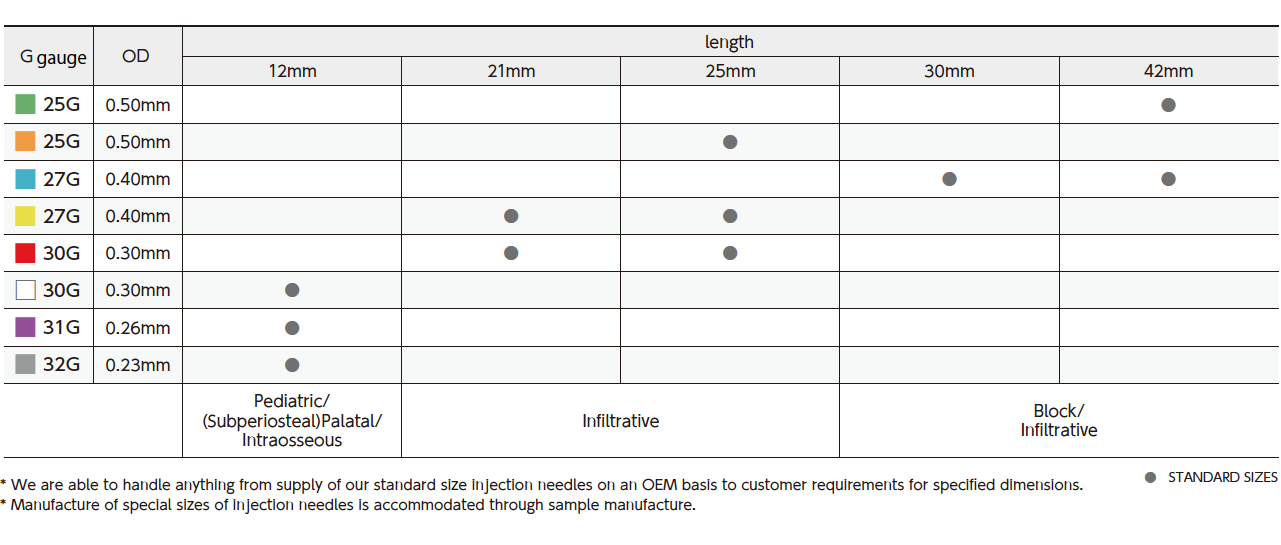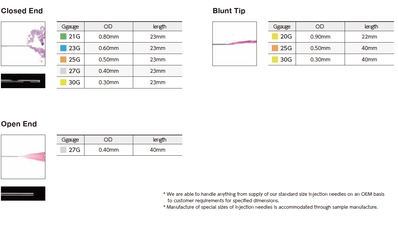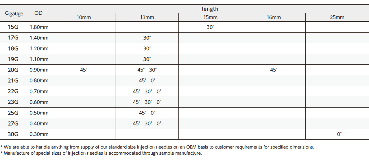 ●Manufacture of special sizes of injection needles is accommodated through sample manufacture.