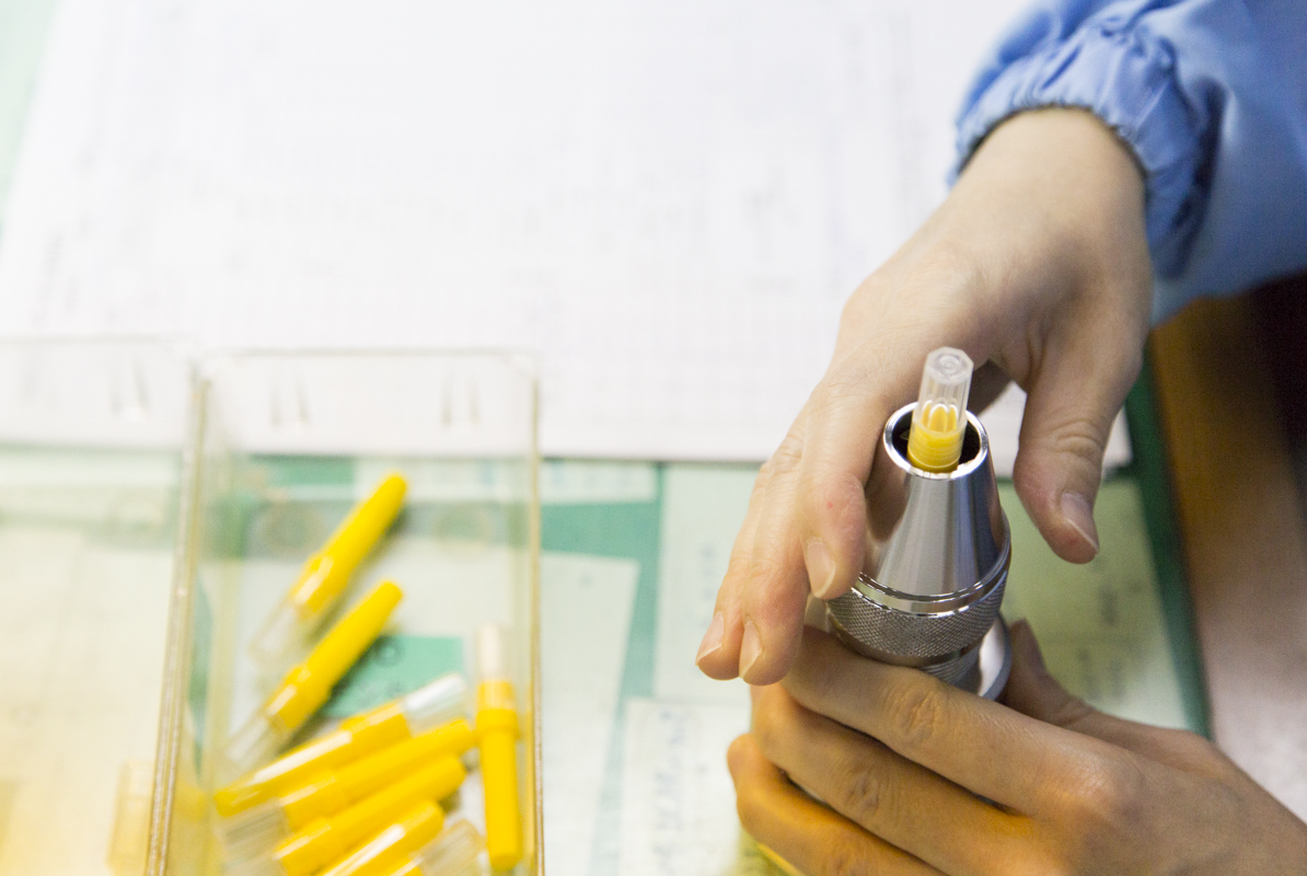 Tube Inspection The fine stainless steel cut tube for use in injection needles is sent to the inspection room and inspected by veteran staff for kinks, scratches, and contamination etc. Diameter, wall thickness, and deflection etc. are accurately measured in sampling inspections, and further inspections conducted to evaluate breaking resistance, bending strength, elasticity, appearance, and inside diameter. Testing is conducted in accordance with an inspection plan, and results recorded. |